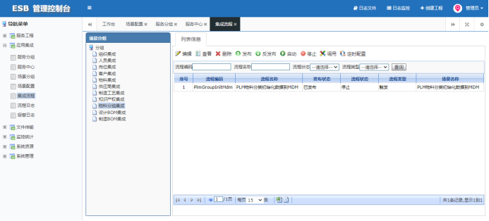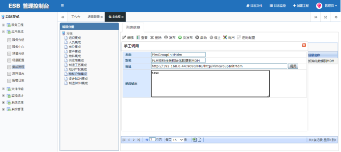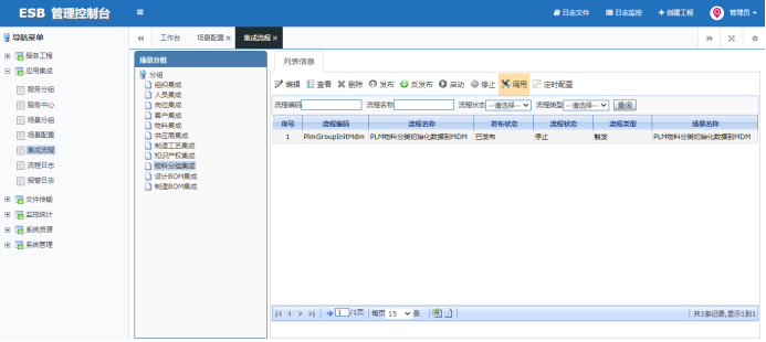 在集成流程提交后在ESB设计器内要对集成流程进行二次开发,根据物料分组的实际业务需要,要开发物料初始化流程、数据同步流程及数据分发流程,使用集成开发可以在ESB管理控制台内对执行结果进行监控统计,并且能进行流程的定时设置、预警机制配置等,流程具体调整内容如下。