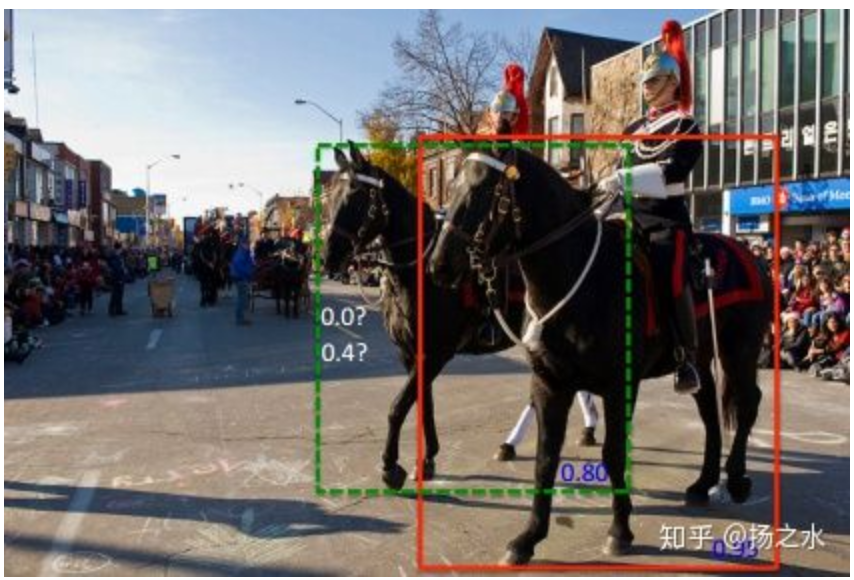 但是另一些情况,NMS会把重叠、贴近的目标筛掉,比如下图中的人和马因为贴的太近,很容易被NMS排除掉一个框……
