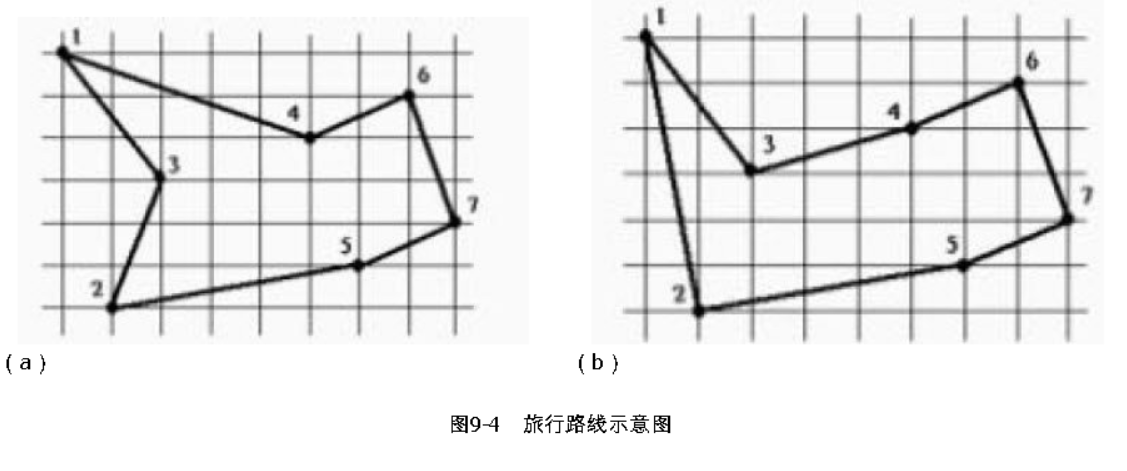 给定平面上n(n≤1000)个点的坐标(按照x递增的顺序给出。各点x坐标不同,且均为正整数),你的任务是设计一条路线,从最左边的点出发,走到最右边的点后再返回,要求除了最左点和最右点之外每个点恰好经过一次,且路径总长度最短。两点间的长度为它们的欧几里德距离,如图9-4所示。