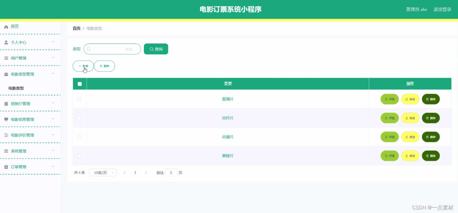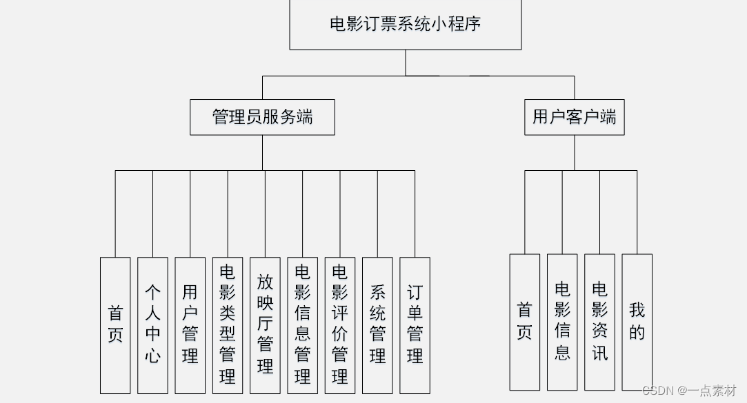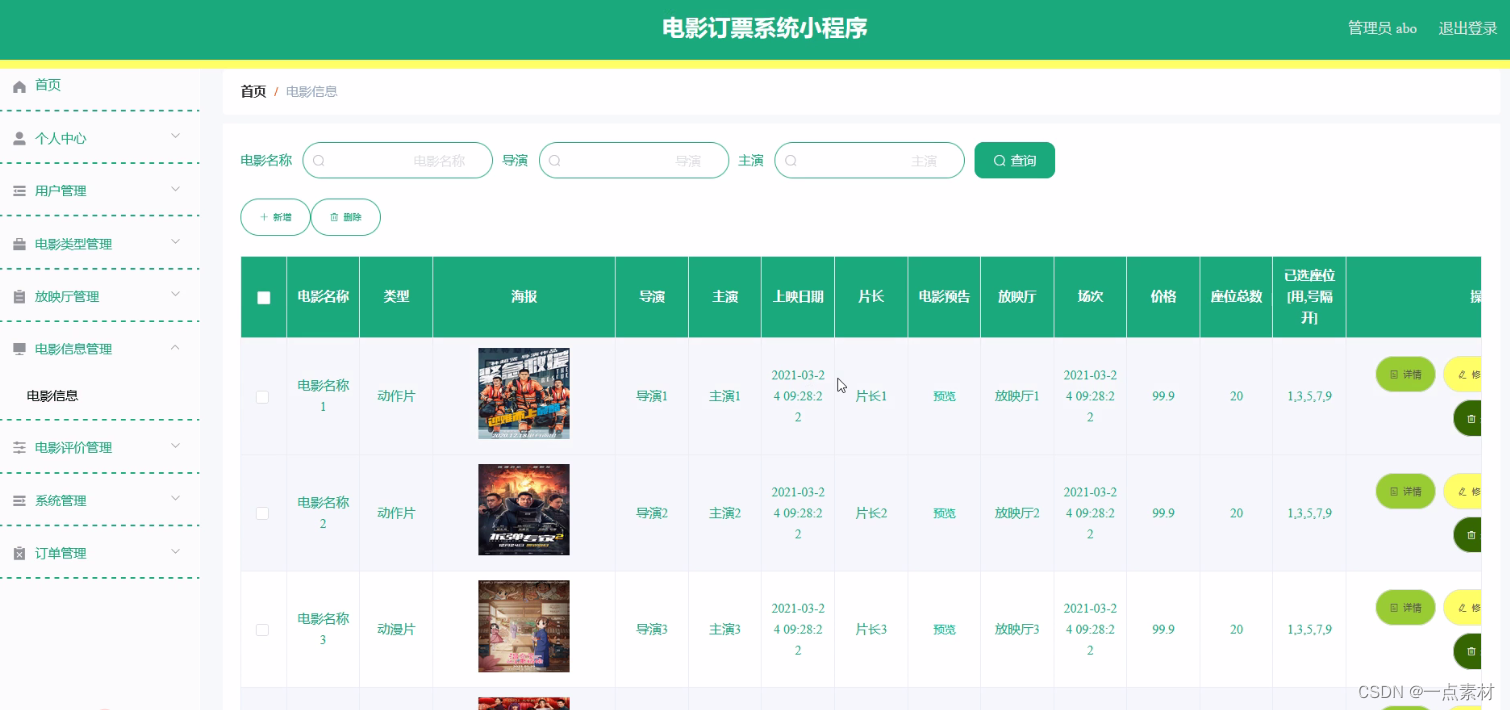 (1)管理员服务端;首页、个人中心、用户管理、电影类型管理、放映厅管理、电影信息管理、电影评价管理、系统管理、订单管理等。