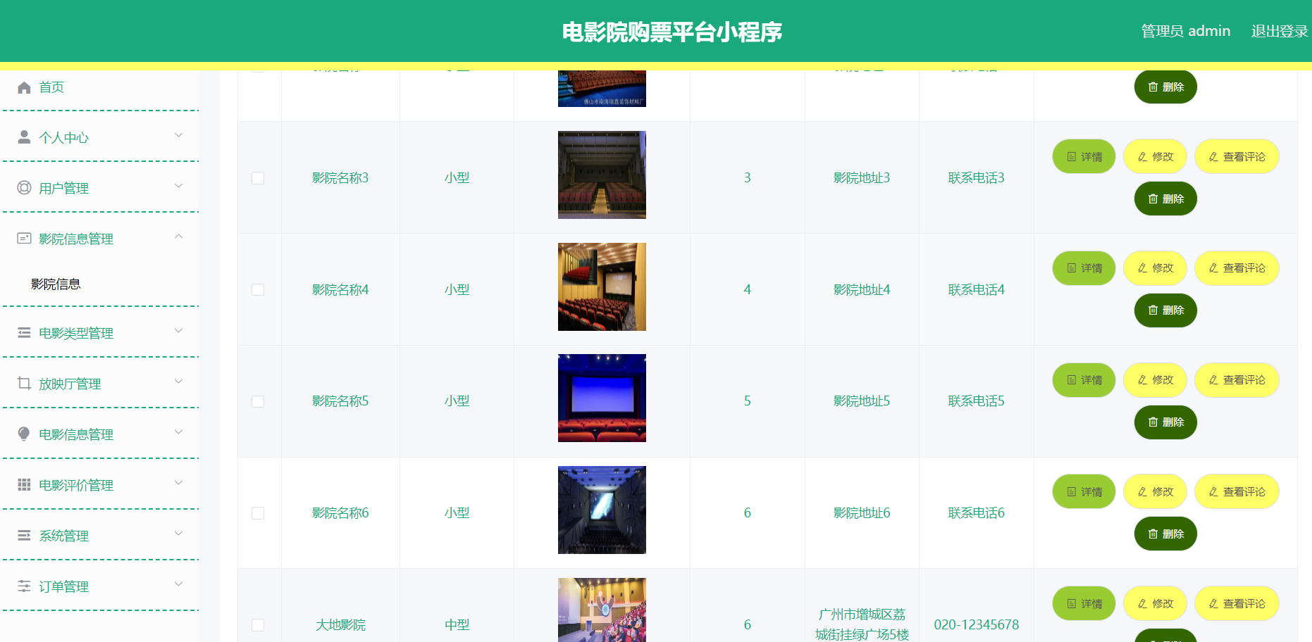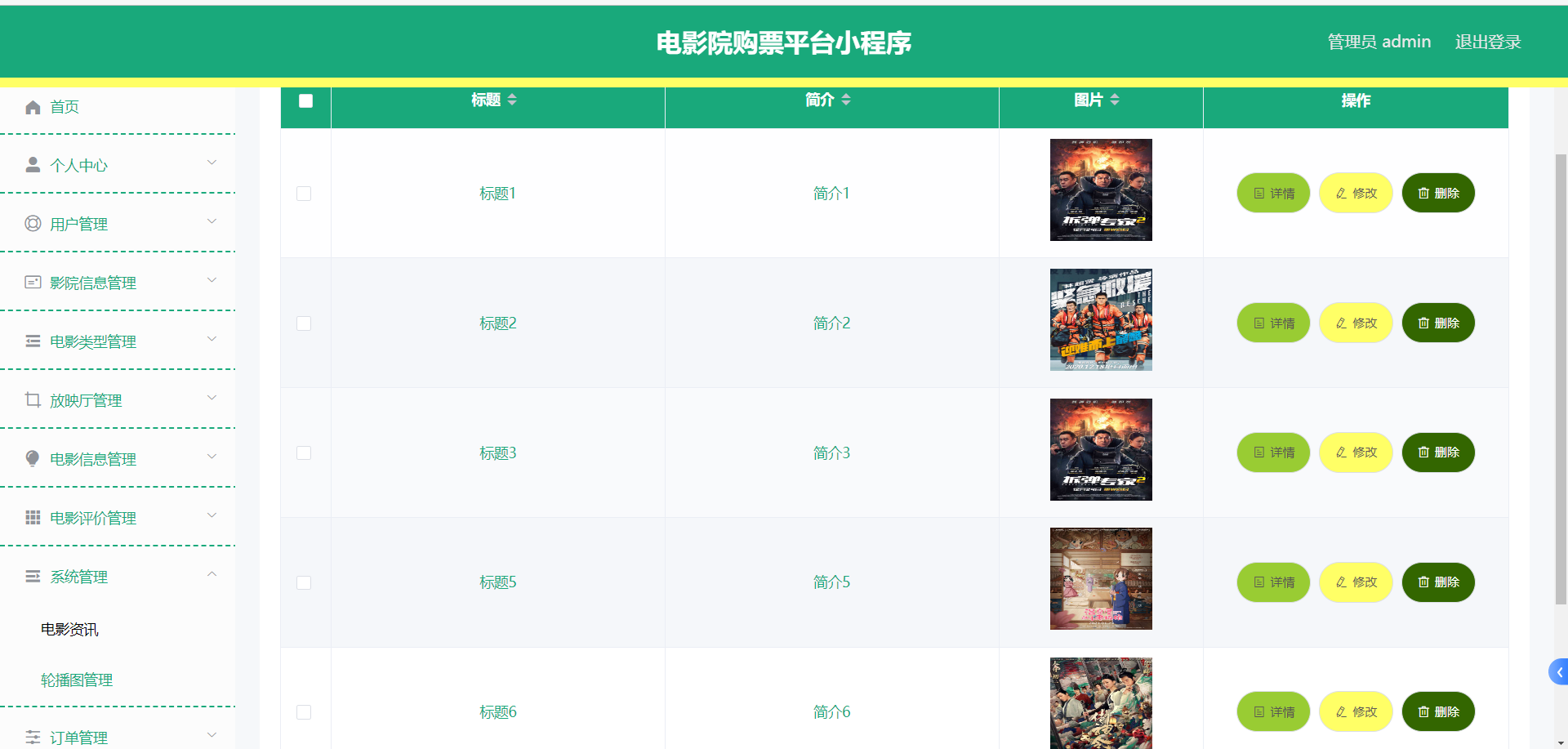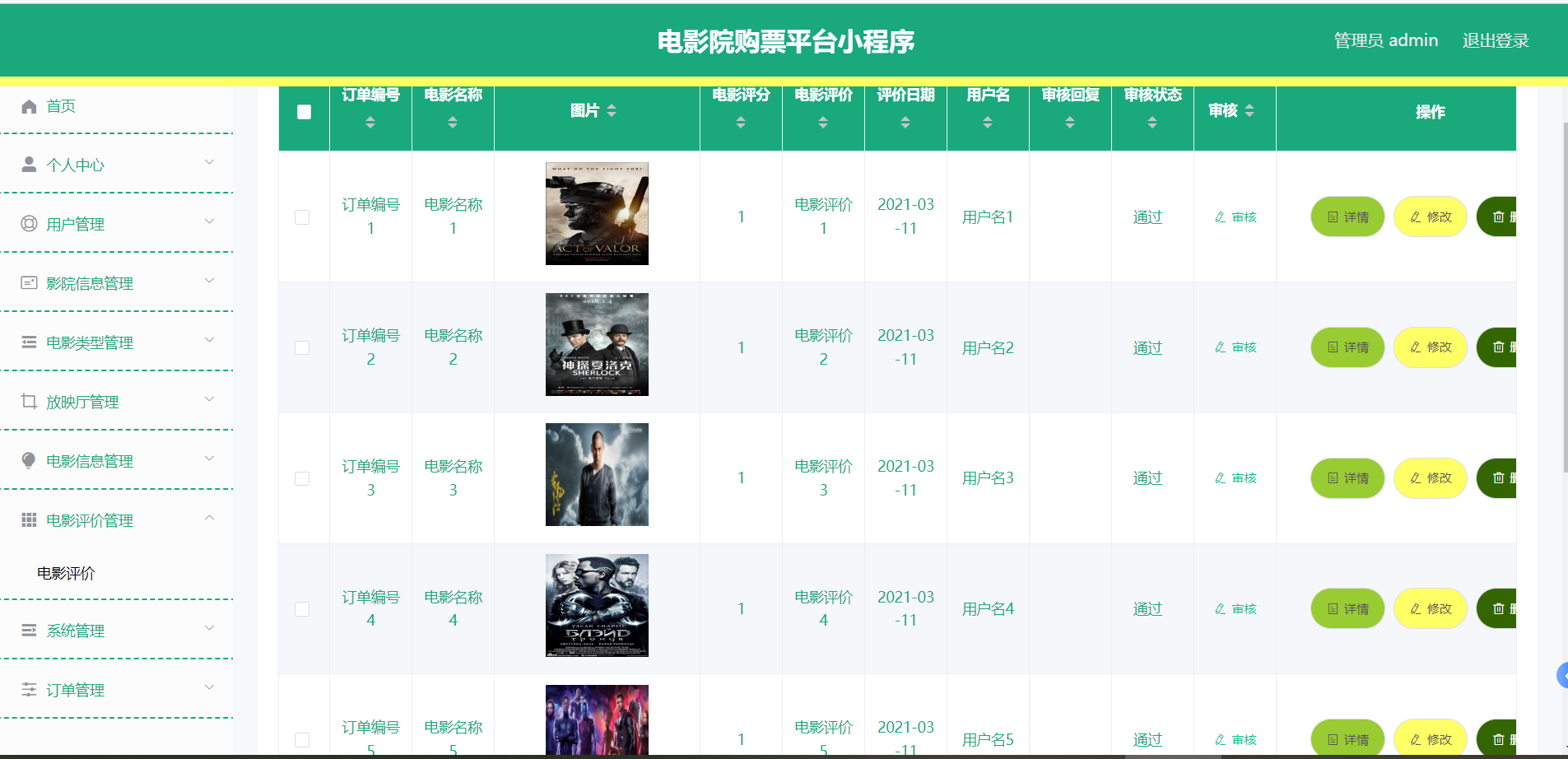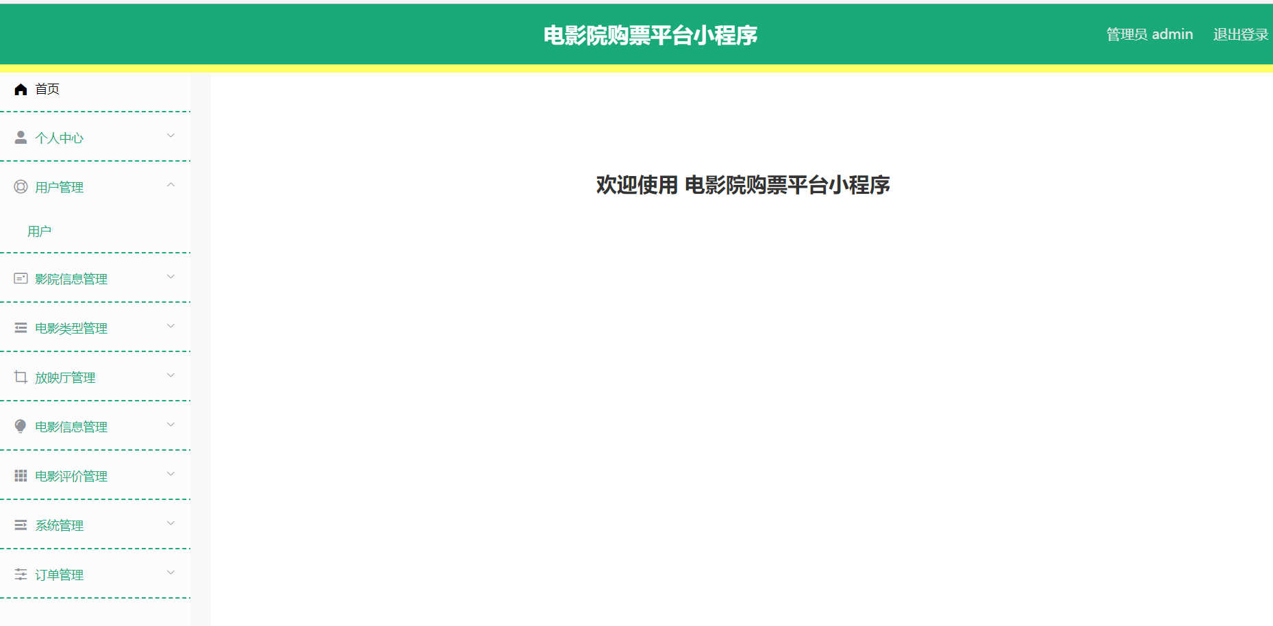 管理员端主要功能有管理员登录、首页,系统管理、电影类型管理、电影详情管理、放映厅管理、订单管理,轮播图,评价管理,修改信息,修改密码、退出等功能。