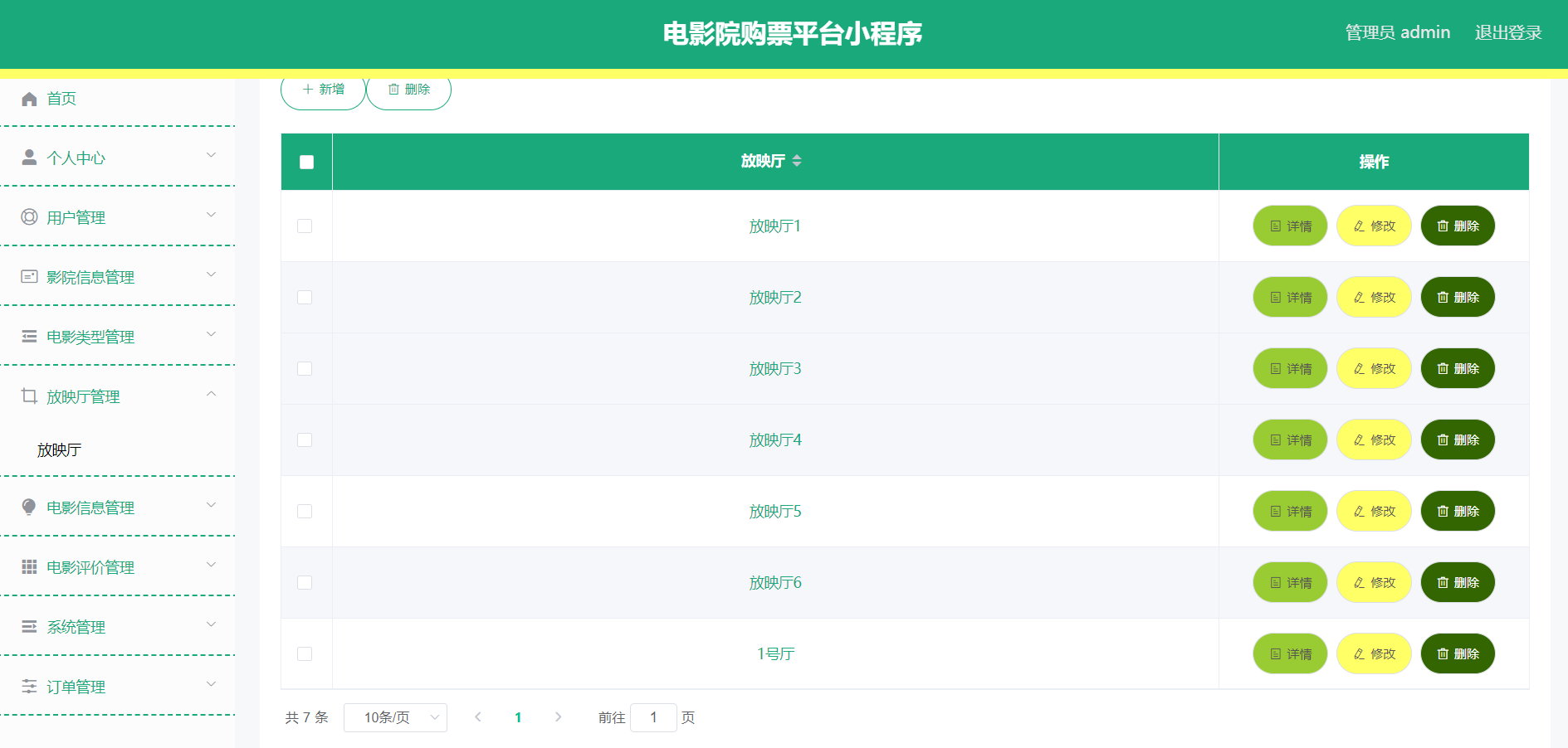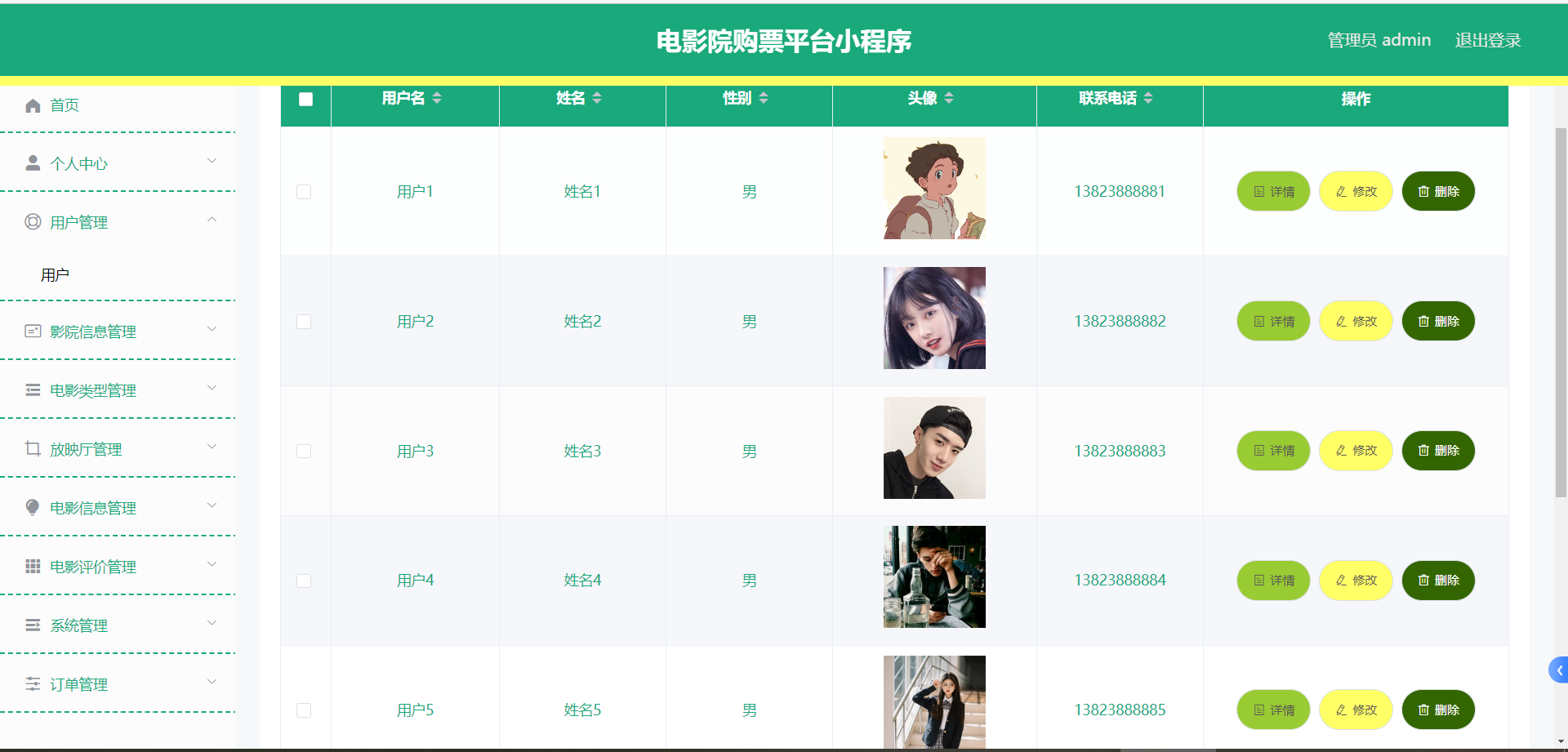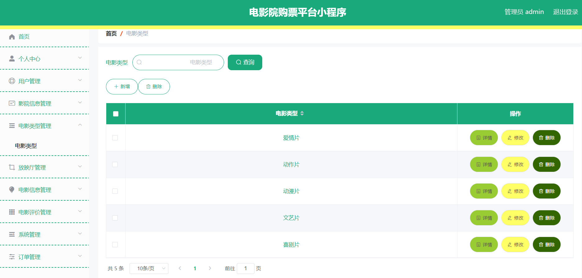 管理员端主要功能有管理员登录、首页,系统管理、电影类型管理、电影详情管理、放映厅管理、订单管理,轮播图,评价管理,修改信息,修改密码、退出等功能。