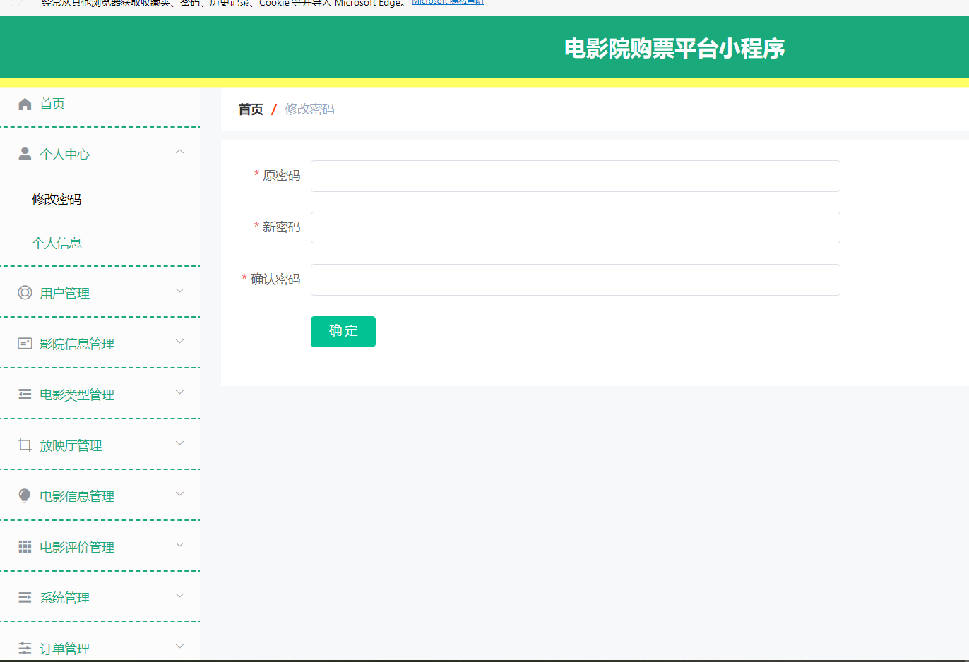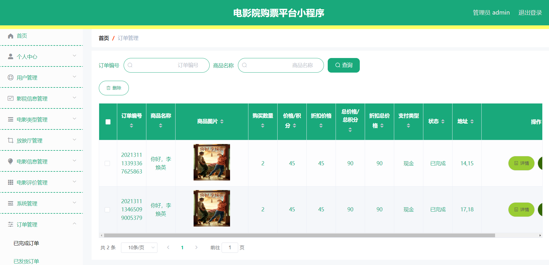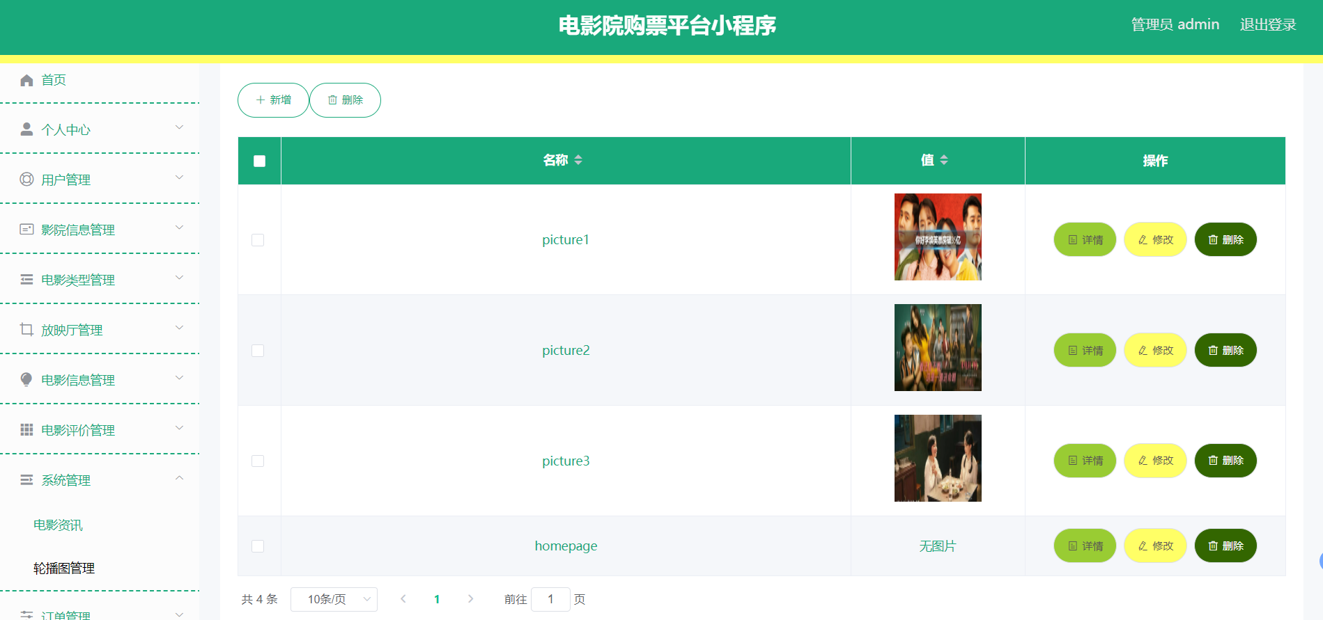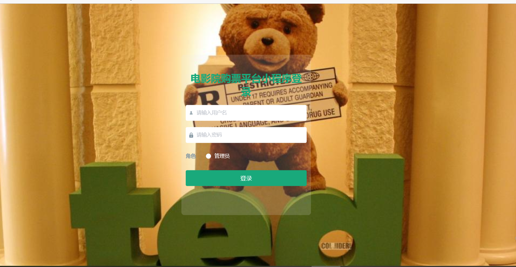 管理员端主要功能有管理员登录、首页,系统管理、电影类型管理、电影详情管理、放映厅管理、订单管理,轮播图,评价管理,修改信息,修改密码、退出等功能。