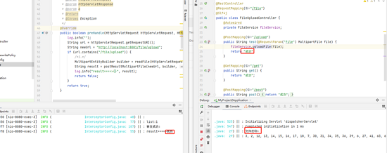 public class InterceptorConfig implements HandlerInterceptor {private static final CloseableHttpClient httpclient;static {//创建http客户端httpclient = HttpClients.custom().useSystemProperties().setRetryHandler(new DefaultHttpRequestRetryHandler(3, true)).build();}/*** 进入controller层之前拦截请求** @param request* @param httpServletResponse* @param o* @return* @throws Exception*/@Overridepublic boolean preHandle(HttpServletRequest request, HttpServletResponse httpServletResponse, Object o) throws Exception {log.info("");String url = request.getRequestURI();String newUrl = "http://localhost:8081/file/upload";if (url.contains("/file/upload")) {String result = null;/*1.第一种读取流方式*/MultipartEntityBuilder builder = readFile(request);result = postResultMultipartFile(newUrl, builder, "文件上传");/*2.第二种读取流方式*//*InputStreamEntity inputStreamEntity = new InputStreamEntity(request.getInputStream(), request.getContentLength(), ContentType.parse(request.getContentType()));result = postResultMultipartFile(newUrl, inputStreamEntity, "文件上传");*/log.info("result====>{}", result);return false;}return true;}/*** post请求接口** @Author zhouxy*/public String postResultMultipartFile(String url, HttpEntity httpEntity, String actionDesc) {HttpEntity responseEntity;try {HttpPost httpPost = new HttpPost(url);httpPost.setEntity(httpEntity);RequestConfig config = RequestConfig.custom().setConnectTimeout(3000).build();httpPost.setConfig(config);log.info("lenght:{}", httpEntity.getContentLength());HttpResponse response = httpclient.execute(httpPost);// 执行提交responseEntity = response.getEntity();if (responseEntity != null) {log.info("responseEntity:{}", responseEntity);// 将响应内容转换为字符串return EntityUtils.toString(responseEntity, Charset.forName("UTF-8"));}} catch (IOException e) {log.error(actionDesc + ":IOException:", e.getMessage());} catch (Exception e) {log.error(actionDesc + ":Exception:", e.getMessage());}return null;}/*** 读取文件** @param request* @return*/private MultipartEntityBuilder readFile(HttpServletRequest request) {MultipartEntityBuilder builder = MultipartEntityBuilder.create();builder.setCharset(Charset.forName("utf-8"));builder.setMode(HttpMultipartMode.BROWSER_COMPATIBLE);//加上此行代码解决返回中文乱码问题FileItemFactory factory = new DiskFileItemFactory();ServletFileUpload upload = new ServletFileUpload(factory);upload.setHeaderEncoding("UTF-8");List list = null;try {list = upload.parseRequest(request);} catch (FileUploadException e) {e.printStackTrace();}log.info("list:{}", list.size());for (FileItem file : list) {//获取文件名(带后缀名)String fileName = file.getName();//获取文件输入流try (InputStream input = file.getInputStream()) {builder.addBinaryBody("file", input, ContentType.MULTIPART_FORM_DATA, fileName);// 文件流} catch (IOException e) {log.error("文件流读取失败:", e);}}return builder;}/*** post请求接口** @Author zhouxy*/public String postResultMultipartFile(String url, MultipartEntityBuilder builder, String actionDesc) {HttpEntity httpEntity;HttpEntity responseEntity;try {HttpPost httpPost = new HttpPost(url);// 添加分销接口默认header,分销新网关凭证httpEntity = builder.build();httpPost.setEntity(httpEntity);HttpResponse response = httpclient.execute(httpPost);// 执行提交log.info("转发成功:");responseEntity = response.getEntity();if (responseEntity != null) {// 将响应内容转换为字符串return EntityUtils.toString(responseEntity, Charset.forName("UTF-8"));}} catch (IOException e) {log.error(actionDesc + ":IOException:", e.getMessage());} catch (Exception e) {log.error(actionDesc + ":Exception:", e.getMessage());}return null;}