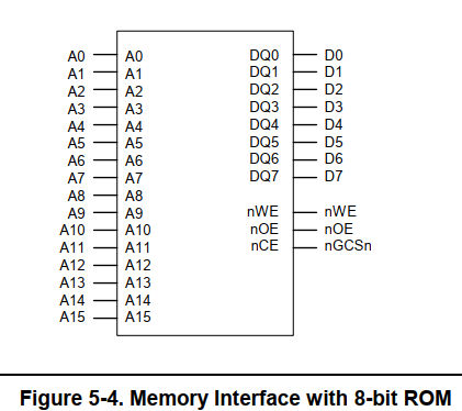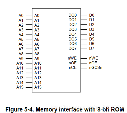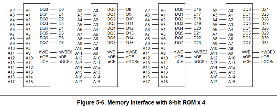 对于8位的rom, CPU发出地址 0b100,内存控制器会将0b100, 0b101, 0b110, 0b111发给rom读取这些地址上的数据,然后rom会将数据返回给内存控制器,内存控制器会将收到的4个8位数据组装成一个32位数据返回给CPU;