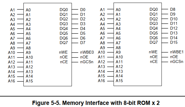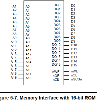 16位的rom一次读写的最小单位是16位,à 对于rom的A0 = 0; A1=1;于是找到了rom上地址1的16位数据,包含我们所需要的数据,最后内存控制器会根据A0来帮我们挑选所需要的8bit数据