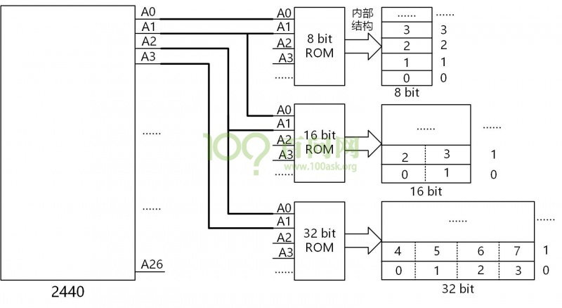 - 当与四个8bit rom组成的一个32bit的rom连接时, 2440的A2与外部芯片的A0连接