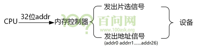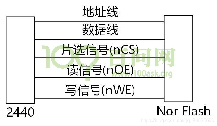 以norflash为例, 2440和nor flash之间有地址线, 数据线, 还有读写, 片选信号等等