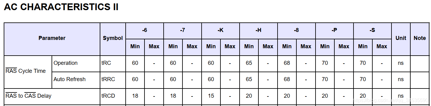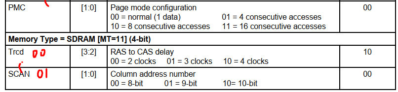 Trcd [3:2] 内存控制器先发出行地址,再发出列地址, 之间间隔多少时间,芯片手册是上是20ns,设置时钟,HCLK是100MHZ,clock为10ns, 所以设置Trcd为00—2clocks