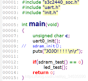内存控制器寄存器一一设置,bank7没用,但是为了以后方便使用,可以一起设置,再写一个测试函数,先向里面连续写1000个数,然后读出对比;SDRAM的起始地址是0x3000 0000,由于是地址,所以需要强制类型转换,于是需要从这个地址之后开始读写,