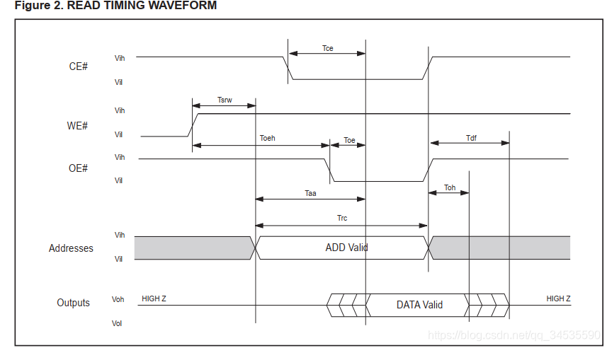 发出读信号(OE#)后, 需要等待Toe(要求大于等于30ns)时间,读信号才有效