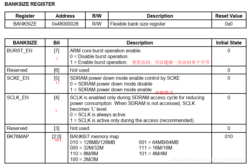 BANK6,BANK7可外接SDRAM,除了上面俩个寄存器需要进行设置,还需要设置几个寄存器,下面一一说明: