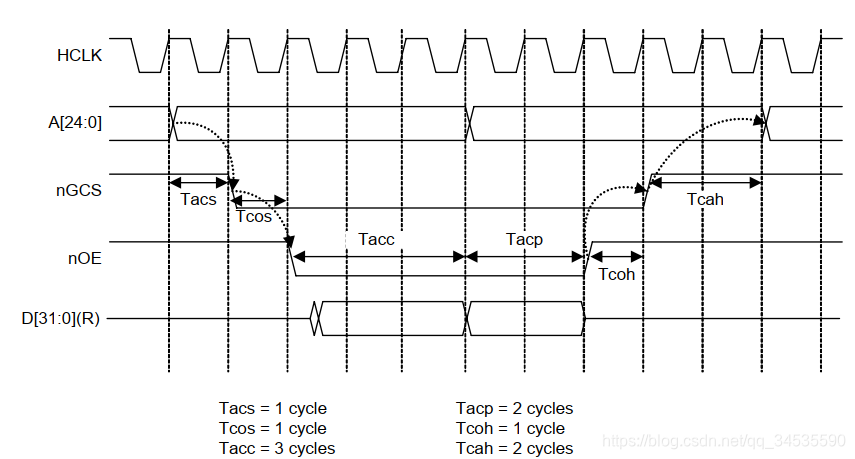 如图是2440 norflash控制器的读时序图, 根据外接芯片的性能进行设置参数, 对于芯片性能好,响应时间快,就可以将参数时间设置小一点,释放更好的性能。