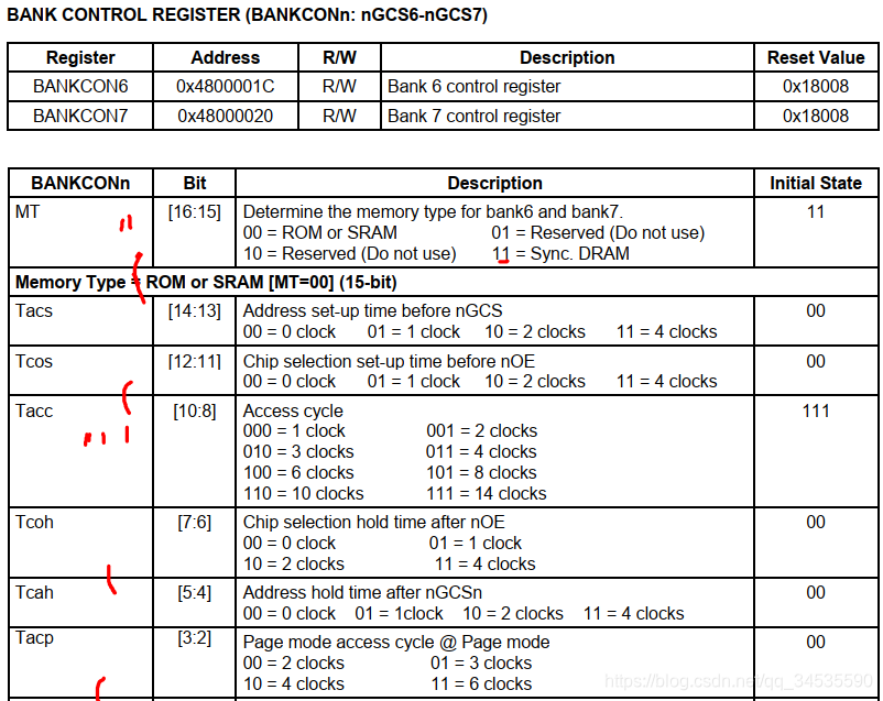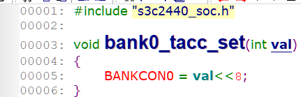Tacc的默认值是14clock,系统刚开始上电采用12MHZ的晶振, HCLK=12MHZ,tacc=1000/12 *14大约是1166ns,这个值很大,满足要求; 启动后的时钟HCLK设置为100MHZ, THclk=10ns, 也就是tacc设置的值需要大于100;