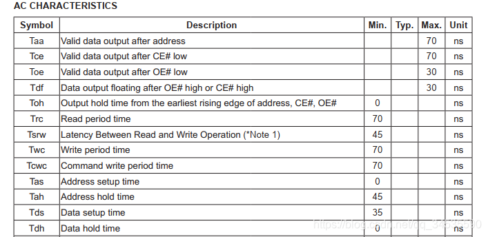 图二中:Taa:valid data output after address 意思是在发出地址信号后过了多长时间,data才有效,最大70ns意思就是极限等待就是70ns,对于有的好芯片可能只需要50ns, 也就是说这个时间是需要大于等于70ns的。于是: