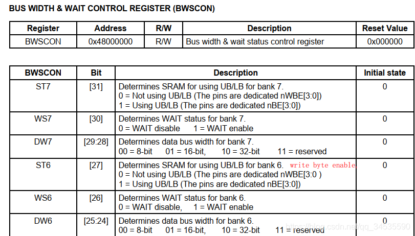 于是BWSCON 寄存器设置为 0x2200 0000;
