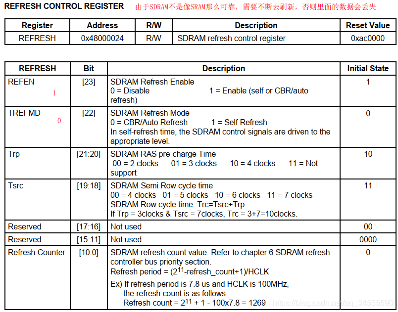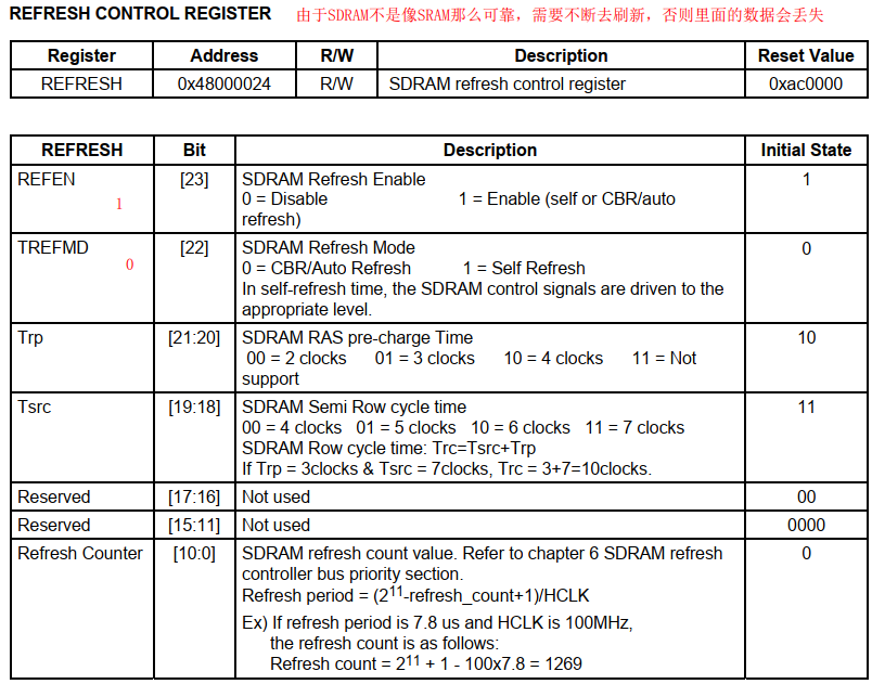 TREFD[22]: SDRAM的刷新功能, 设置默认刷新, 1- 一般是在系统休眠的时候使用,0