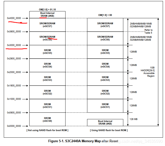 当cpu发出的指令的地址范围处于0x3000 0000~0x4000 0000 ,内存控制器就会使得nGCS7处于低电平,sdRAM 被选中