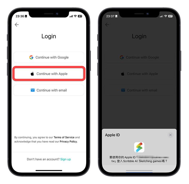如果要自己开始玩的话,点选下方的+ 号,第一次使用App 会要求我们先注册,你可以透过Google 帐号、Apple ID 或是Email 的方式注册、登入。