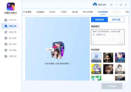 首先,我要向你介绍AI图片全能王,这款软件的功能确实是名副其实的丰富。我们在进行AI绘画的过程中只需输入一段文字内容,然后它会使用深度学习算法和艺术风格转换技术,将这款文字内容以各种绘画风格以及模型来重新演绎。无论是卡通动漫、3D效果还是素描等风格,它都能给我们带来惊喜。
