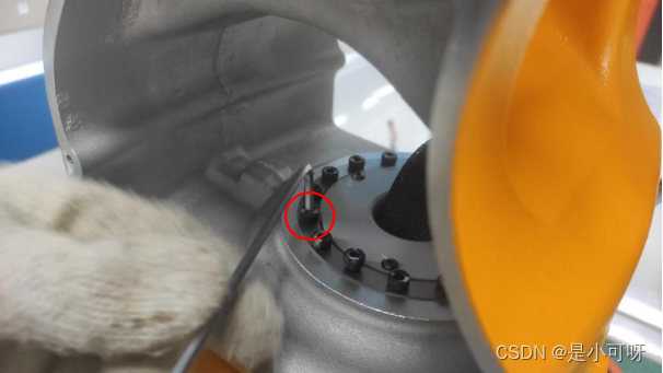 (3))将管线包从底座中拉出,使用M4力矩扳手将红色标记处的一圈12个螺钉卸掉,便可拆卸1轴减速器。