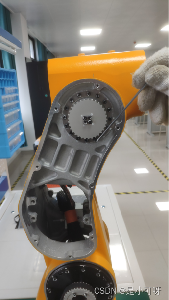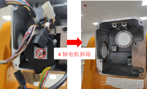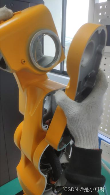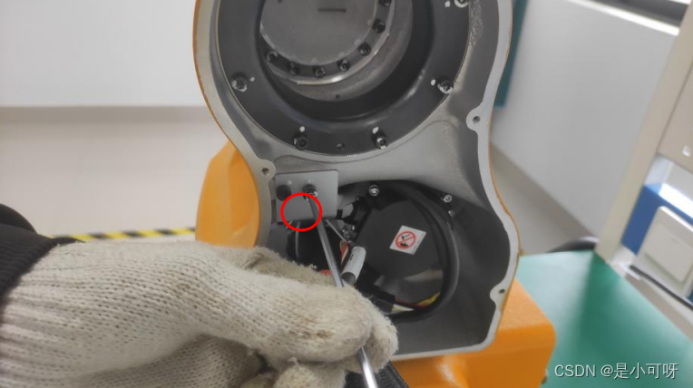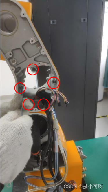 (1)用手取出小臂-大臂处过线套,将固定管线的轧带用斜口钳剪断,并使用M4力矩扳手拆卸钣金件M4螺丝2个,分离3轴电机接头。