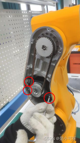 (2)使用M5力矩扳手将红色标记的3个螺钉拆掉,便可取下3轴电机和同步带。