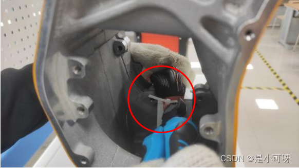 (3)将固定管线的轧带用斜口钳剪断,使用M4力矩扳手拆卸钣金件M4螺丝2个,再将管线从关节处过线。