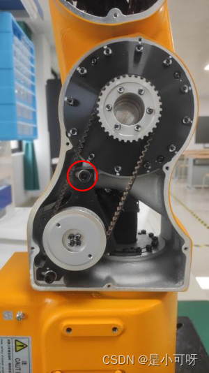 (3)使用M6力矩扳手将红色标记的2个螺钉卸掉,将2轴电机和同步带取出。