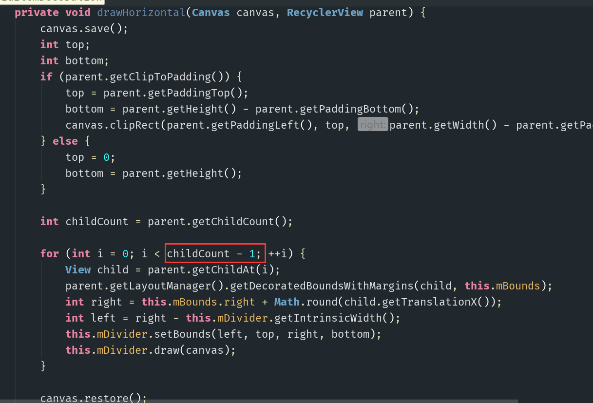 解决 网上参考了一些方法 大多都是继承 ItemDecoration 重写其方法 然后在循环创建分割线的循环里减一