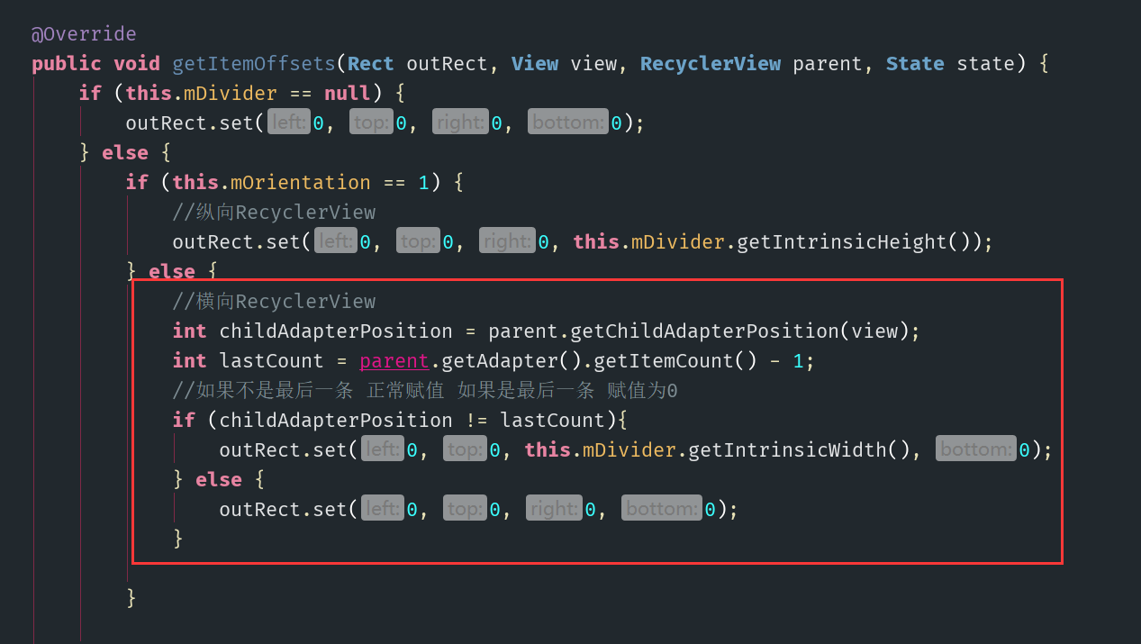 import android.view.View;/*** Created by qzp on 2019/6/13. 去除recyclerView最后一条分割线*/public class MyItemDecoration extends ItemDecoration {public static final int HORIZONTAL = 0;public static final int VERTICAL = 1;private static final String TAG = "DividerItem";private static final int[] ATTRS = new int[]{16843284};private Drawable mDivider;private int mOrientation;private final Rect mBounds = new Rect();public MyItemDecoration(Context context, int orientation) {TypedArray a = context.obtainStyledAttributes(ATTRS);this.mDivider = a.getDrawable(0);if (this.mDivider == null) {Log.w("DividerItem", "@android:attr/listDivider was not set in the theme used for this DividerItemDecoration. Please set that attribute all call setDrawable()");}a.recycle();this.setOrientation(orientation);}public void setOrientation(int orientation) {if (orientation != 0 && orientation != 1) {throw new IllegalArgumentException("Invalid orientation. It should be either HORIZONTAL or VERTICAL");} else {this.mOrientation = orientation;}}public void setDrawable(@NonNull Drawable drawable) {if (drawable == null) {throw new IllegalArgumentException("Drawable cannot be null.");} else {this.mDivider = drawable;}}@Overridepublic void onDraw(Canvas c, RecyclerView parent, State state) {if (parent.getLayoutManager() != null && this.mDivider != null) {if (this.mOrientation == 1) {this.drawVertical(c, parent);} else {this.drawHorizontal(c, parent);}}}private void drawVertical(Canvas canvas, RecyclerView parent) {canvas.save();int left;int right;if (parent.getClipToPadding()) {left = parent.getPaddingLeft();right = parent.getWidth() - parent.getPaddingRight();canvas.clipRect(left, parent.getPaddingTop(), right, parent.getHeight() - parent.getPaddingBottom());} else {left = 0;right = parent.getWidth();}int childCount = parent.getChildCount();//当最后一个子项的时候去除下划线for (int i = 0; i < childCount - 1; ++i) {View child = parent.getChildAt(i);parent.getDecoratedBoundsWithMargins(child, this.mBounds);int bottom = this.mBounds.bottom + Math.round(child.getTranslationY());int top = bottom - this.mDivider.getIntrinsicHeight();this.mDivider.setBounds(left, top, right, bottom);this.mDivider.draw(canvas);}canvas.restore();}private void drawHorizontal(Canvas canvas, RecyclerView parent) {canvas.save();int top;int bottom;if (parent.getClipToPadding()) {top = parent.getPaddingTop();bottom = parent.getHeight() - parent.getPaddingBottom();canvas.clipRect(parent.getPaddingLeft(), top, parent.getWidth() - parent.getPaddingRight(), bottom);} else {top = 0;bottom = parent.getHeight();}int childCount = parent.getChildCount();for (int i = 0; i < childCount - 1; ++i) {View child = parent.getChildAt(i);parent.getLayoutManager().getDecoratedBoundsWithMargins(child, this.mBounds);int right = this.mBounds.right + Math.round(child.getTranslationX());int left = right - this.mDivider.getIntrinsicWidth();this.mDivider.setBounds(left, top, right, bottom);this.mDivider.draw(canvas);}canvas.restore();}@Overridepublic void getItemOffsets(Rect outRect, View view, RecyclerView parent, State state) {if (this.mDivider == null) {outRect.set(0, 0, 0, 0);} else {if (this.mOrientation == 1) {//纵向RecyclerViewoutRect.set(0, 0, 0, this.mDivider.getIntrinsicHeight());} else {//横向RecyclerViewint childAdapterPosition = parent.getChildAdapterPosition(view);int lastCount = parent.getAdapter().getItemCount() - 1;//如果不是最后一条 正常赋值 如果是最后一条 赋值为0if (childAdapterPosition != lastCount){outRect.set(0, 0, this.mDivider.getIntrinsicWidth(), 0);} else {outRect.set(0, 0, 0, 0);}}}}