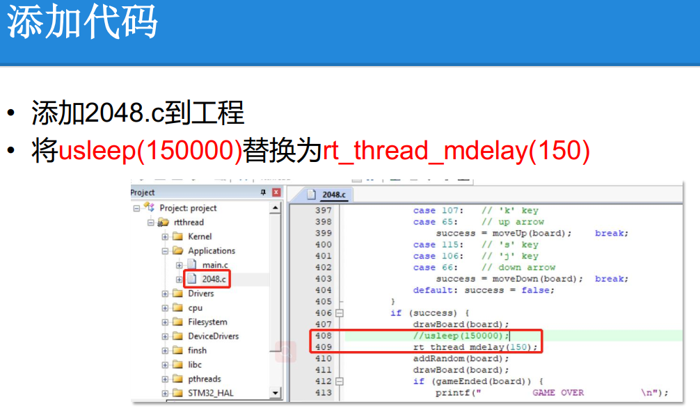 1. 2048源代码地址 2. 开启硬件支持 3. 重新生成工程 4. 添加代码 5. 修改软件 6. 编译下载,运行程序