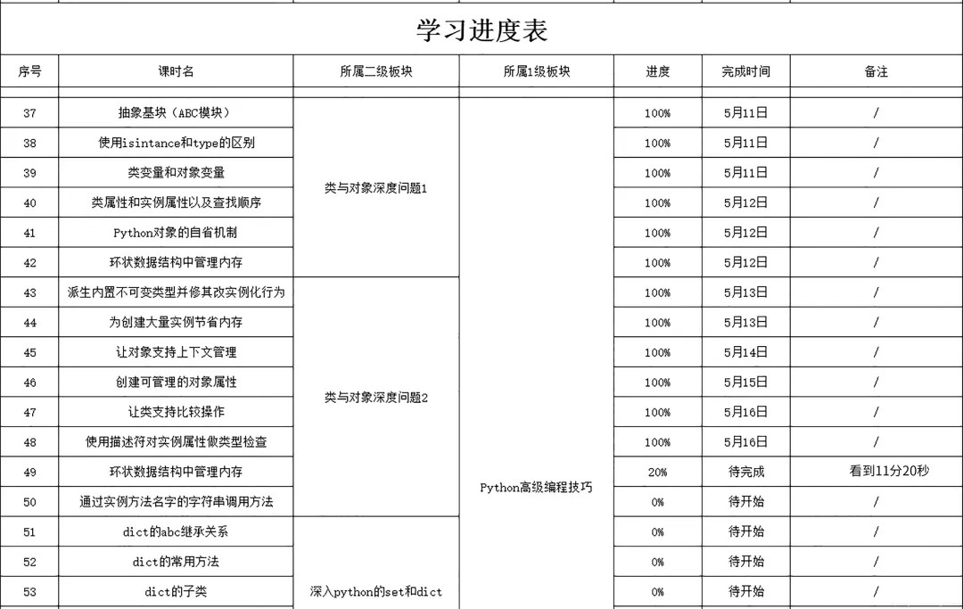 我的学习进度表是用EXCEL来做的,里面具体到每1节课,有时候1天是3节课,有时候是1节课,当时我的判断标准也很简单,看课时长度来做规划,每当我按照要求完成1个学习目标,我就会在后面的进度标上100%,如果有事情耽误了,我会记下时间便于下次继续学习。