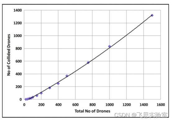 图12显示了使用不同数量的无人机每次运行时记录的碰撞绝对数量。例如,当有750架无人机时,相互碰撞的无人机略少于600架。图中显示,碰撞次数是线性的,与无人机的数量成正比。