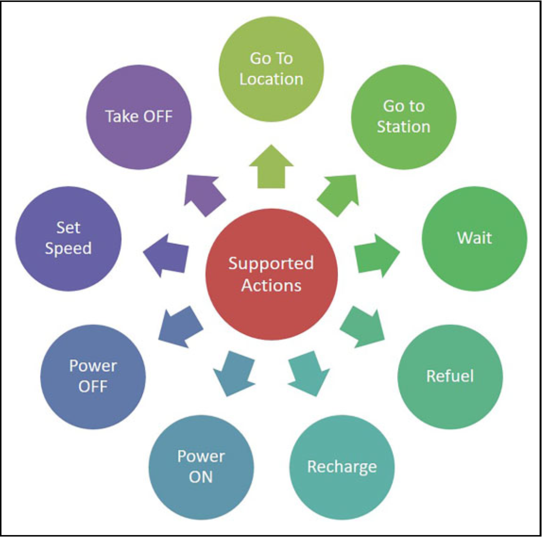 无人机支持的动作如图5所示,用可读语言描述了无人机在模拟会话期间能够执行的可能基本要素。在模拟过程中,这些动作被解码并转换为Unity可以处理的C代码。