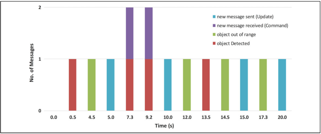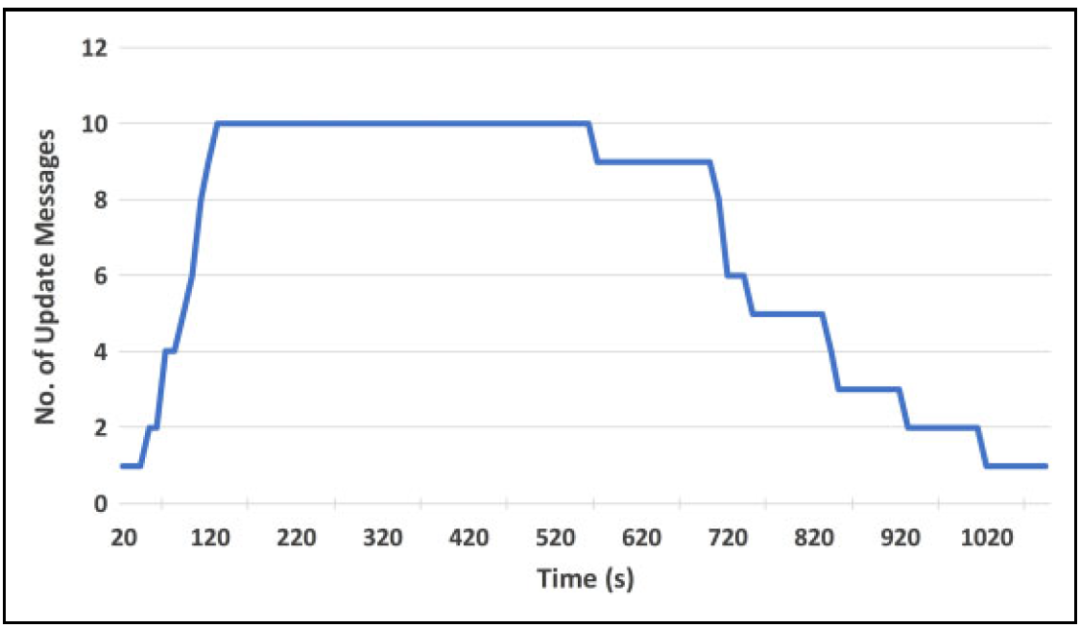每个无人机都有一个预定义的目标。该场景的目的是检查通信日志,该日志记录了媒体从所有无人机看到的消息。这种情况下的无人机已配置为每10秒广播一次定期消息。图10显示了模拟时间(t=0)和(t=1100)之间的更新消息数。该图汇总了每10秒广播的定期消息数。