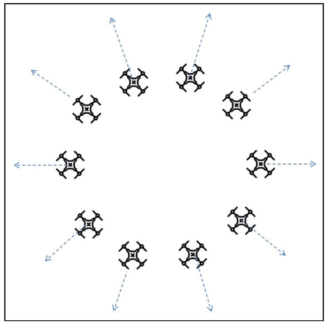在此场景中,演示了定期更新消息的概念。该场景的重点是显示无人机起飞和降落时的定期消息量。在该场景中,10架无人机从一个点发射,但时间不同。它们向外起飞,如图9所示。它们都以相同的速度行驶。因为10架无人机中的每一架都朝着不同的方向飞行,他们永远不会崩溃。