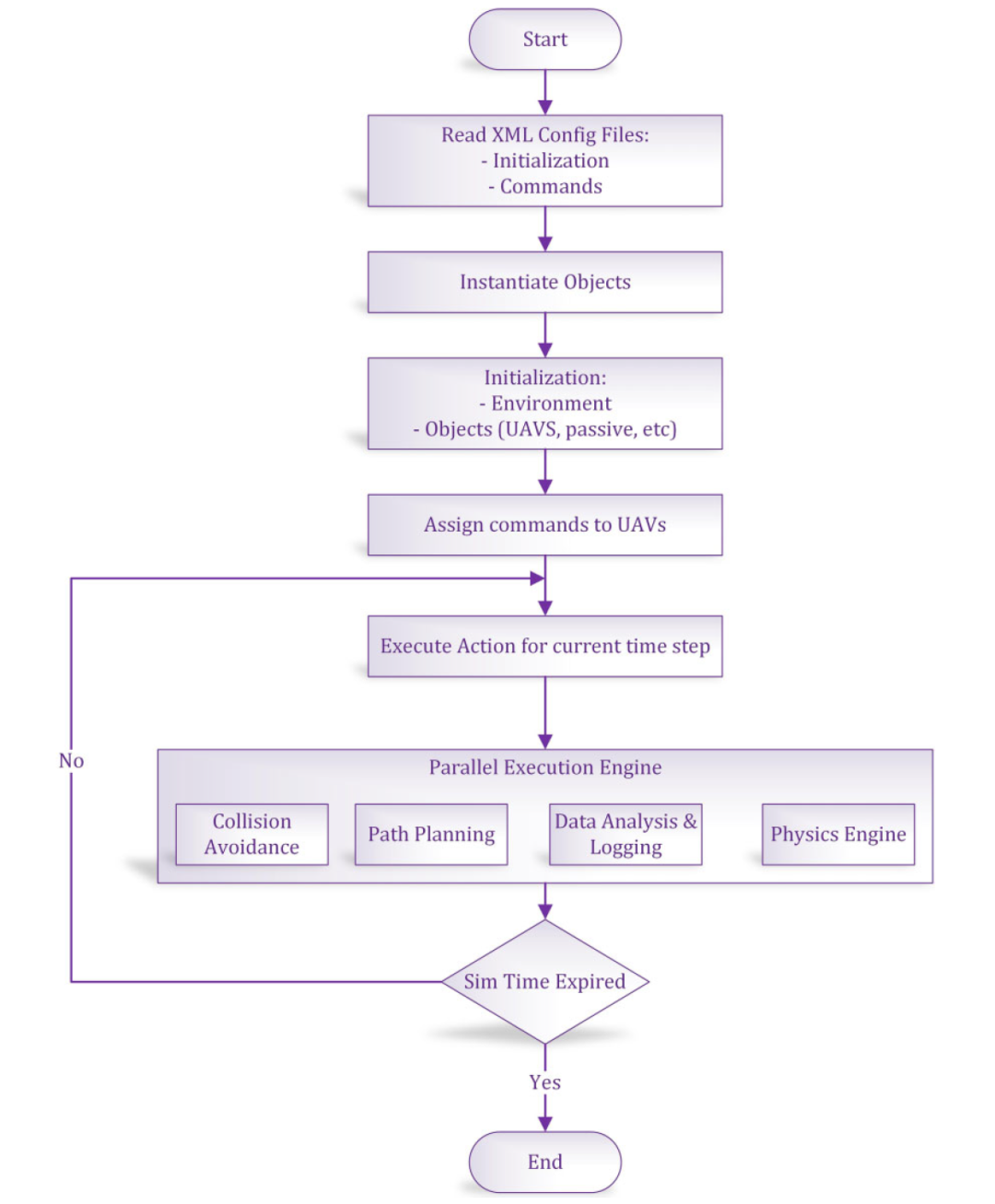 这里提出的模拟器旨在使研究人员能够轻松创建自动化和灵活的无人机相关测试环境。它允许创建不同的无人机模拟场景,并能够测试算法,如感知和避免(S&A)和碰撞避免算法。该模拟器使用户可以在每个模拟会话中完全控制无人机的数量、每个无人机的类型、初始位置和目标位置等。它为用户提供了指定环境属性的能力,例如环境的维度和被动对象的数量、维度和位置。可以控制无人机以预定义的高度和速度从起点移动到目标位置。无人机起飞并开始执行任务后,也允许改变高度、速度、旋转,甚至目标位置。