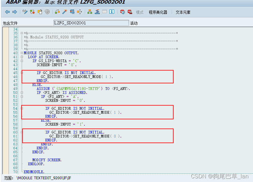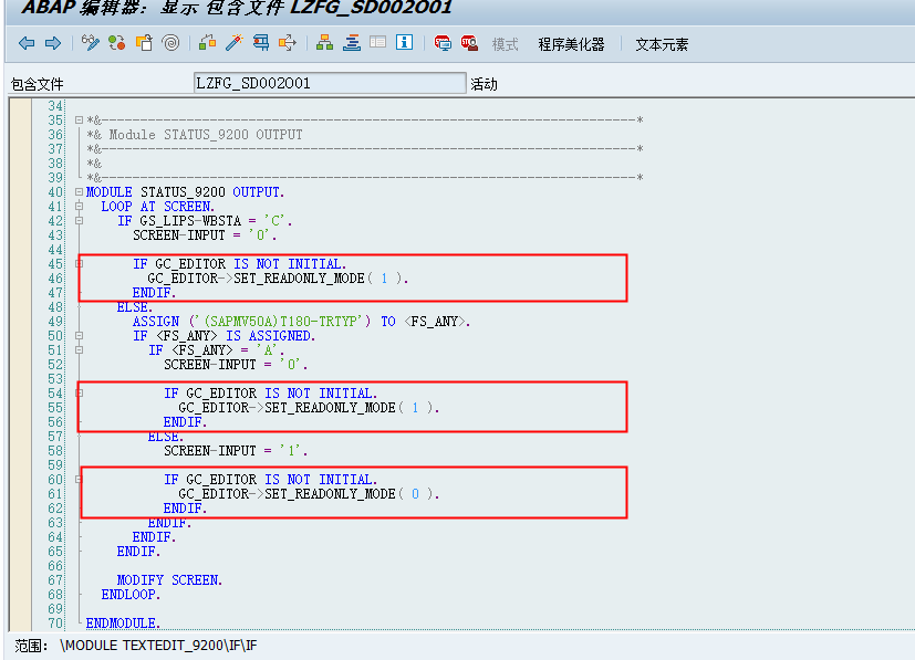 MODULE STATUS_9200 OUTPUT.LOOP AT SCREEN.IF GS_LIPS-WBSTA = 'C'.SCREEN-INPUT = '0'.IF GC_EDITOR IS NOT INITIAL.GC_EDITOR->SET_READONLY_MODE( 1 ).ENDIF.ELSE.ASSIGN ('(SAPMV50A)T180-TRTYP') TO .IF IS ASSIGNED.IF = 'A'.SCREEN-INPUT = '0'.IF GC_EDITOR IS NOT INITIAL.GC_EDITOR->SET_READONLY_MODE( 1 ).ENDIF.ELSE.SCREEN-INPUT = '1'.IF GC_EDITOR IS NOT INITIAL.GC_EDITOR->SET_READONLY_MODE( 0 ).ENDIF.ENDIF.ENDIF.ENDIF.MODIFY SCREEN.ENDLOOP.ENDMODULE.*&---------------------------------------------------------------------*