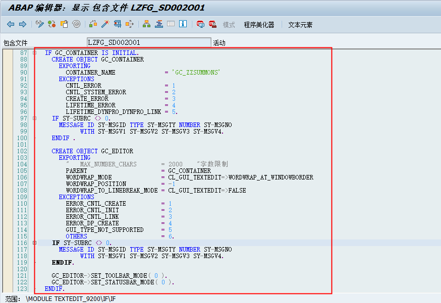 MODULE TEXTEDIT_9200 OUTPUT.DATA: LT_ZTSD053 TYPE STANDARD TABLE OF ZTSD053,LS_ZTSD053 TYPE ZTSD053,LV_ZZSUMMONS TYPE STRING,LV_LFIMG TYPE STRING,LV_STRING TYPE STRING.CLEAR: LT_ZTSD053, LV_ZZSUMMONS, LV_LFIMG, LV_STRING.* 创建文本框IF GC_CONTAINER IS INITIAL.CREATE OBJECT GC_CONTAINEREXPORTINGCONTAINER_NAME = 'GC_ZZSUMMONS'EXCEPTIONSCNTL_ERROR = 1CNTL_SYSTEM_ERROR = 2CREATE_ERROR = 3LIFETIME_ERROR = 4LIFETIME_DYNPRO_DYNPRO_LINK = 5.IF SY-SUBRC <> 0.MESSAGE ID SY-MSGID TYPE SY-MSGTY NUMBER SY-MSGNOWITH SY-MSGV1 SY-MSGV2 SY-MSGV3 SY-MSGV4.ENDIF .CREATE OBJECT GC_EDITOREXPORTING" MAX_NUMBER_CHARS = 2000 "字数限制PARENT = GC_CONTAINERWORDWRAP_MODE = CL_GUI_TEXTEDIT=>WORDWRAP_AT_WINDOWBORDERWORDWRAP_POSITION = -1WORDWRAP_TO_LINEBREAK_MODE = CL_GUI_TEXTEDIT=>FALSEEXCEPTIONSERROR_CNTL_CREATE = 1ERROR_CNTL_INIT = 2ERROR_CNTL_LINK = 3ERROR_DP_CREATE = 4GUI_TYPE_NOT_SUPPORTED = 5OTHERS = 6.IF SY-SUBRC <> 0.MESSAGE ID SY-MSGID TYPE SY-MSGTY NUMBER SY-MSGNOWITH SY-MSGV1 SY-MSGV2 SY-MSGV3 SY-MSGV4.ENDIF.GC_EDITOR->SET_TOOLBAR_MODE( 0 ).GC_EDITOR->SET_STATUSBAR_MODE( 0 ).ENDIF.* 获取内存数据IMPORT LT_ZTSD053 = LT_ZTSD053 FROM MEMORY ID 'ZTSD053'.IF SY-SUBRC <> 0.