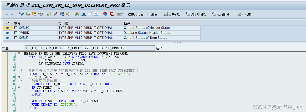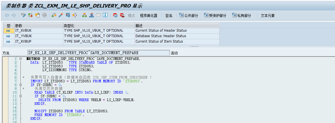②对交货单处理增强点LE_SHP_DELIVERY_PROC创建实施,修改方法IF_EX_LE_SHP_DELIVERY_PROC~SAVE_DOCUMENT_PREPARE将ABAP内存数据更新数据库表