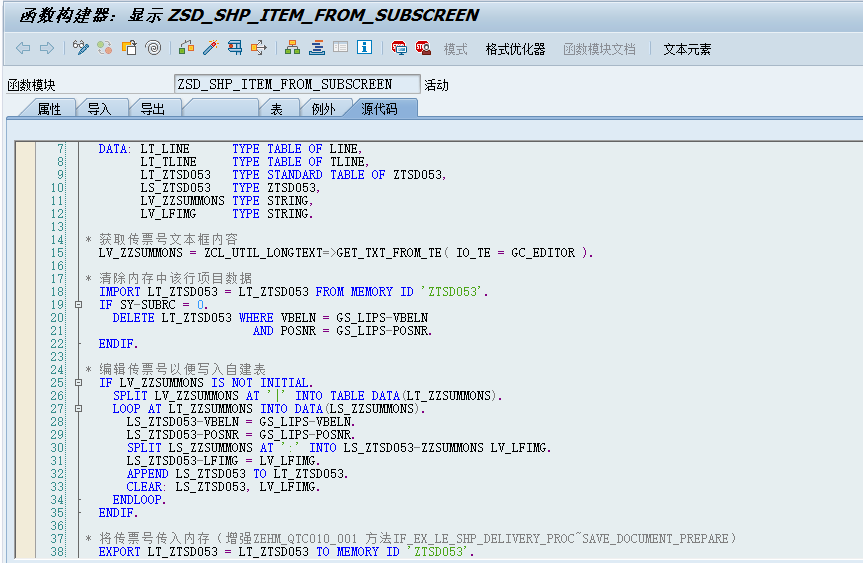 *"----------------------------------------------------------------------DATA: LT_LINE TYPE TABLE OF LINE,LT_TLINE TYPE TABLE OF TLINE,LT_ZTSD053 TYPE STANDARD TABLE OF ZTSD053,LS_ZTSD053 TYPE ZTSD053,LV_ZZSUMMONS TYPE STRING,LV_LFIMG TYPE STRING.* 获取传票号文本框内容LV_ZZSUMMONS = ZCL_UTIL_LONGTEXT=>GET_TXT_FROM_TE( IO_TE = GC_EDITOR ).* 清除内存中该行项目数据IMPORT LT_ZTSD053 = LT_ZTSD053 FROM MEMORY ID 'ZTSD053'.IF SY-SUBRC = 0.DELETE LT_ZTSD053 WHERE VBELN = GS_LIPS-VBELNAND POSNR = GS_LIPS-POSNR.ENDIF.* 编辑传票号以便写入自建表IF LV_ZZSUMMONS IS NOT INITIAL.SPLIT LV_ZZSUMMONS AT '|' INTO TABLE DATA(LT_ZZSUMMONS).LOOP AT LT_ZZSUMMONS INTO DATA(LS_ZZSUMMONS).LS_ZTSD053-VBELN = GS_LIPS-VBELN.LS_ZTSD053-POSNR = GS_LIPS-POSNR.SPLIT LS_ZZSUMMONS AT ':' INTO LS_ZTSD053-ZZSUMMONS LV_LFIMG.LS_ZTSD053-LFIMG = LV_LFIMG.APPEND LS_ZTSD053 TO LT_ZTSD053.CLEAR: LS_ZTSD053, LV_LFIMG.ENDLOOP.ENDIF.* 将传票号传入内存(增强ZEHM_QTC010_001 方法IF_EX_LE_SHP_DELIVERY_PROC~SAVE_DOCUMENT_PREPARE)EXPORT LT_ZTSD053 = LT_ZTSD053 TO MEMORY ID 'ZTSD053'.ES_LIPS = GS_LIPS.ES_LIPS-ZZSUMMONS = LV_ZZSUMMONS.ENDFUNCTION.