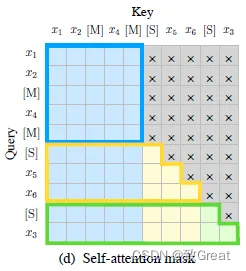 Self-Attention Mask矩阵:灰色区域被遮蔽了。A 部分文本可以关注它们自己(蓝框)但不能关注 B。B 部分文本可以关注 A 及其在 B 中的前文(黄色和绿色框对应于两个跨度)。[M] := [掩码],[S] := [开始],[E] := [结束]。