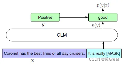 如图中的示例,标签“positive”和“negative”映射到单词“good”和“bad”。在这种情况下,GLM 使用交叉熵损失进行了微调。