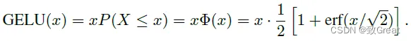 对GELU具体来说,神经元输入x可以乘以m~Bernoulli(Φ(x)),其中Φ(x) = P(X≤x);X~ N (0, 1)是标准正态分布的累积分布函数。选择此分布是因为神经元输入倾向于遵循正态分布,尤其是使用批归一化时。由于高斯的累积分布函数通常使用误差函数 计算,因此高斯误差线性单位 (GELU)定义为: