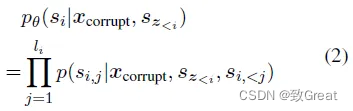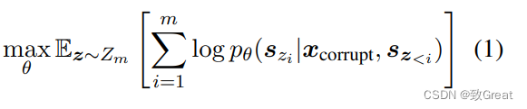跨度的顺序是随机排列的,类似于排列语言模型 ( XLNet )。形式上,令Zm为长度为m 的索引序列 [1, 2, , …, m ] 的所有可能排列的集合,并且s_z < i为 [s_z1, …, s _ zi -1],预训练目标为定义为: