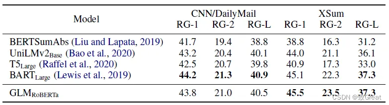 GLM RoBERTa可以实现匹配Seq2Seq BART模型的性能,并且优于T5和UniLMv2。