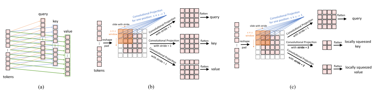 (a) ViT 中的线性投影 (b) 卷积投影 (c) 压缩卷积投影