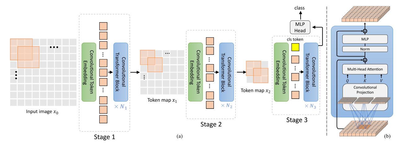 - 卷积令牌嵌入层,本质就是一个二维卷积,每次卷积都能够实现减少 Transformer 令牌序列长度,并且具备空间信息