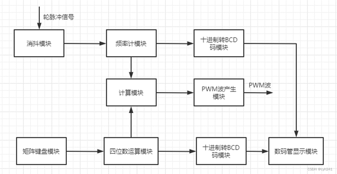 对于输入电路,可以应用数字键盘实现十进制数的数据输入,并通过比较器,让输入的数据和锯齿波产生模块产生的数据进行比较,进而产生pwm波来控制直流电机旋转。